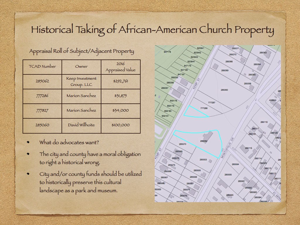 The use of the city’s eminent domain power in this case was accompanied by efforts on the part of city planners to extend Grove Boulevard to Montopolis Drive. This is why the city currently owns a significantly sized road easement through the property. This was and remains another example of disrespectful and unmindful land use decisions on the part of the city that is soaked with the foul stench of institutional racism.